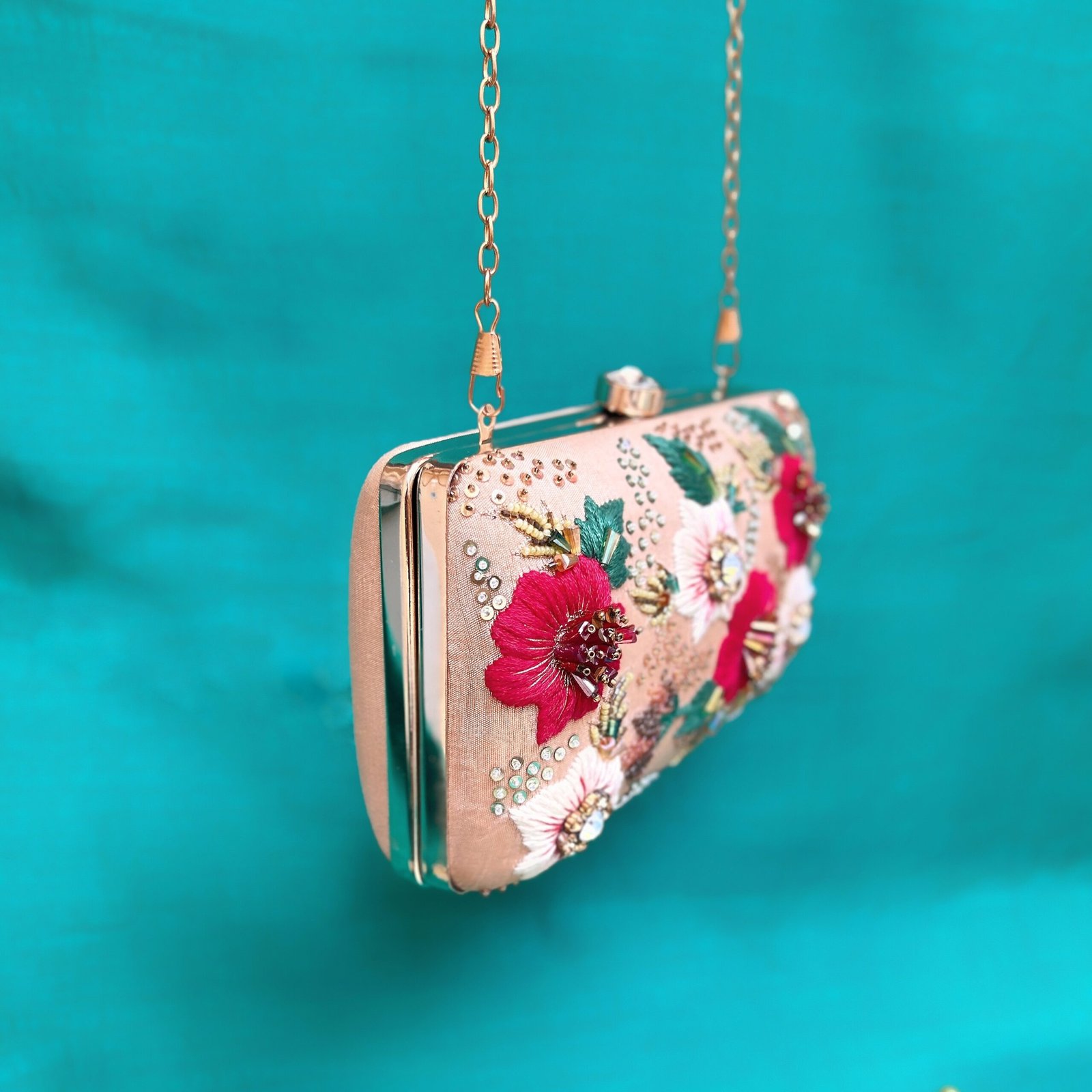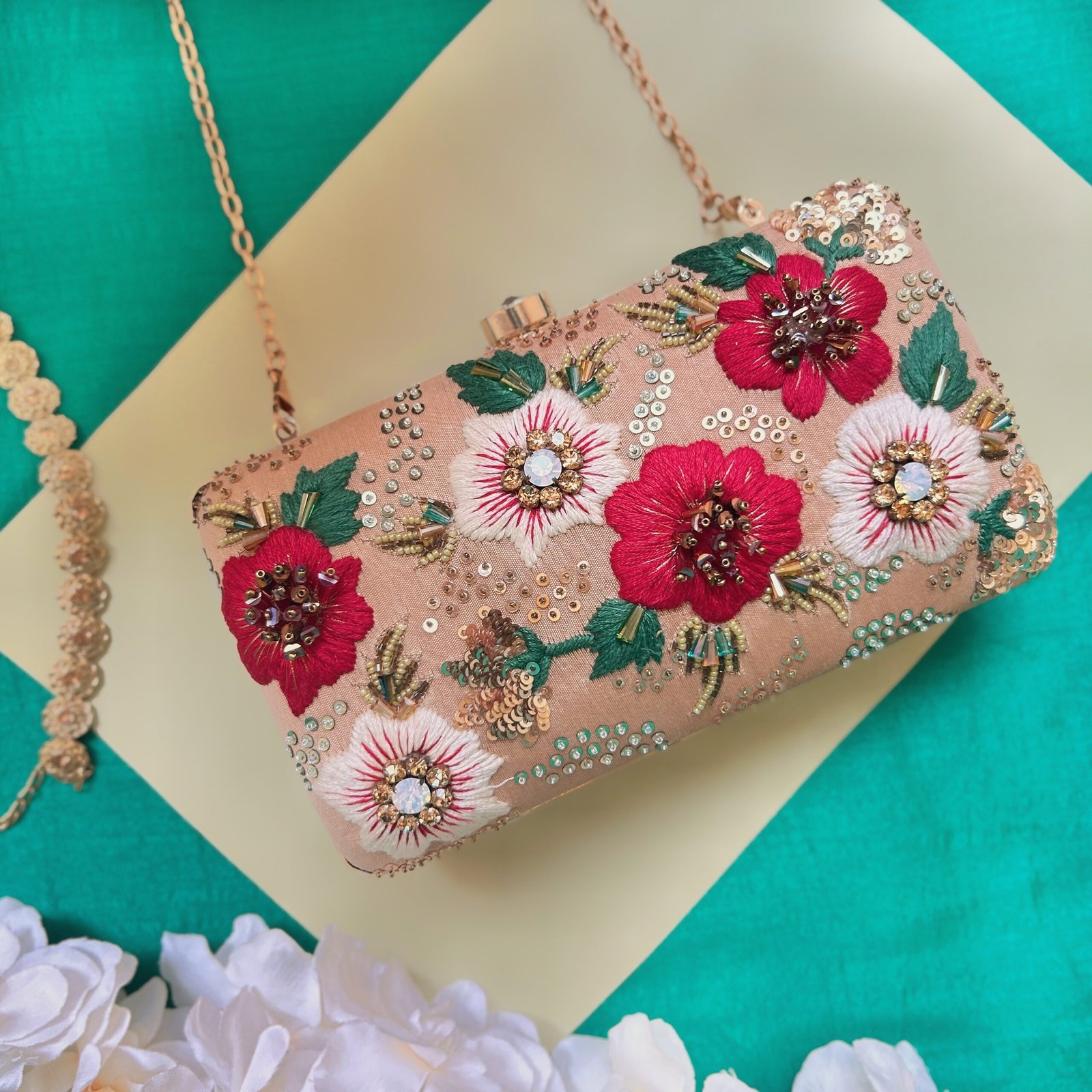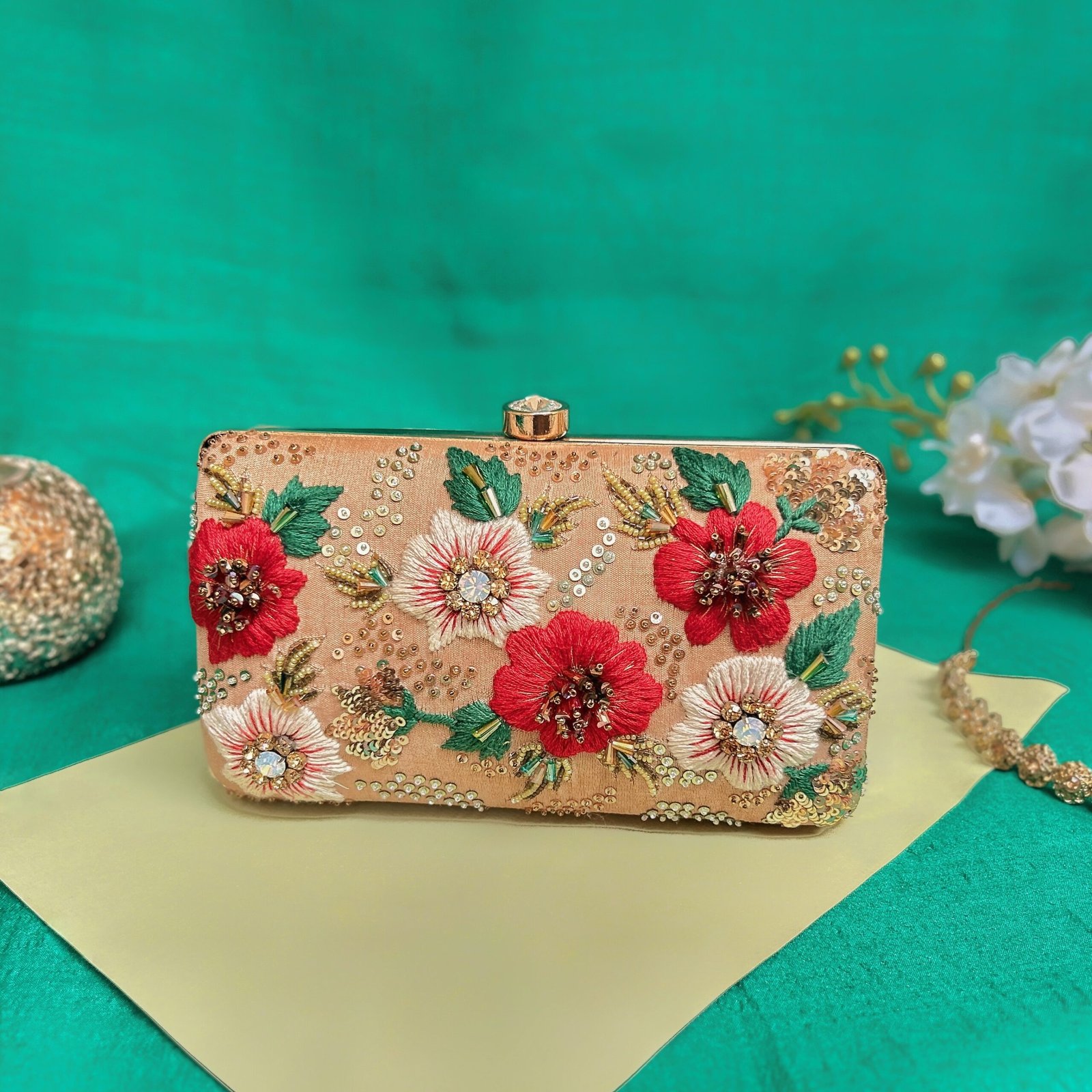 Elevate your festive or formal look with the Golden Blossom Clutch, a luxurious accessory featuring exquisite floral embroidery highlighted with shimmering sequins and beadwork on rich golden fabric. This beautifully handcrafted clutch combines elegance and style, making it perfect for weddings, receptions, or any glamorous occasion.