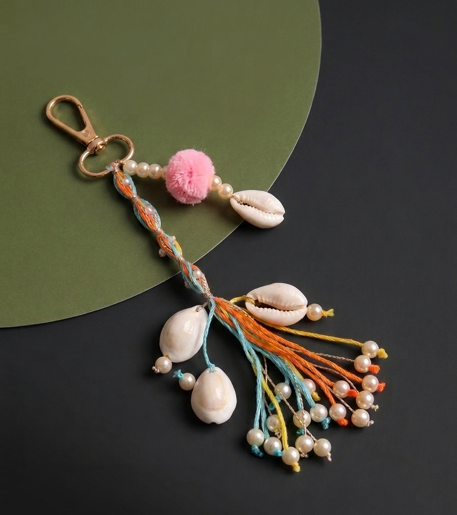 Product Overview: Add a splash of vibrant, bohemian style to your favorite handbag with this handcrafted bag charm. Featuring a delightful mix of natural textures and cheerful colors, it’s the perfect way to personalize your accessory. Natural cowrie shells and lustrous pearl beads create a coastal-inspired cascade, while a soft, playful pom-pom adds a touch of whimsical charm.